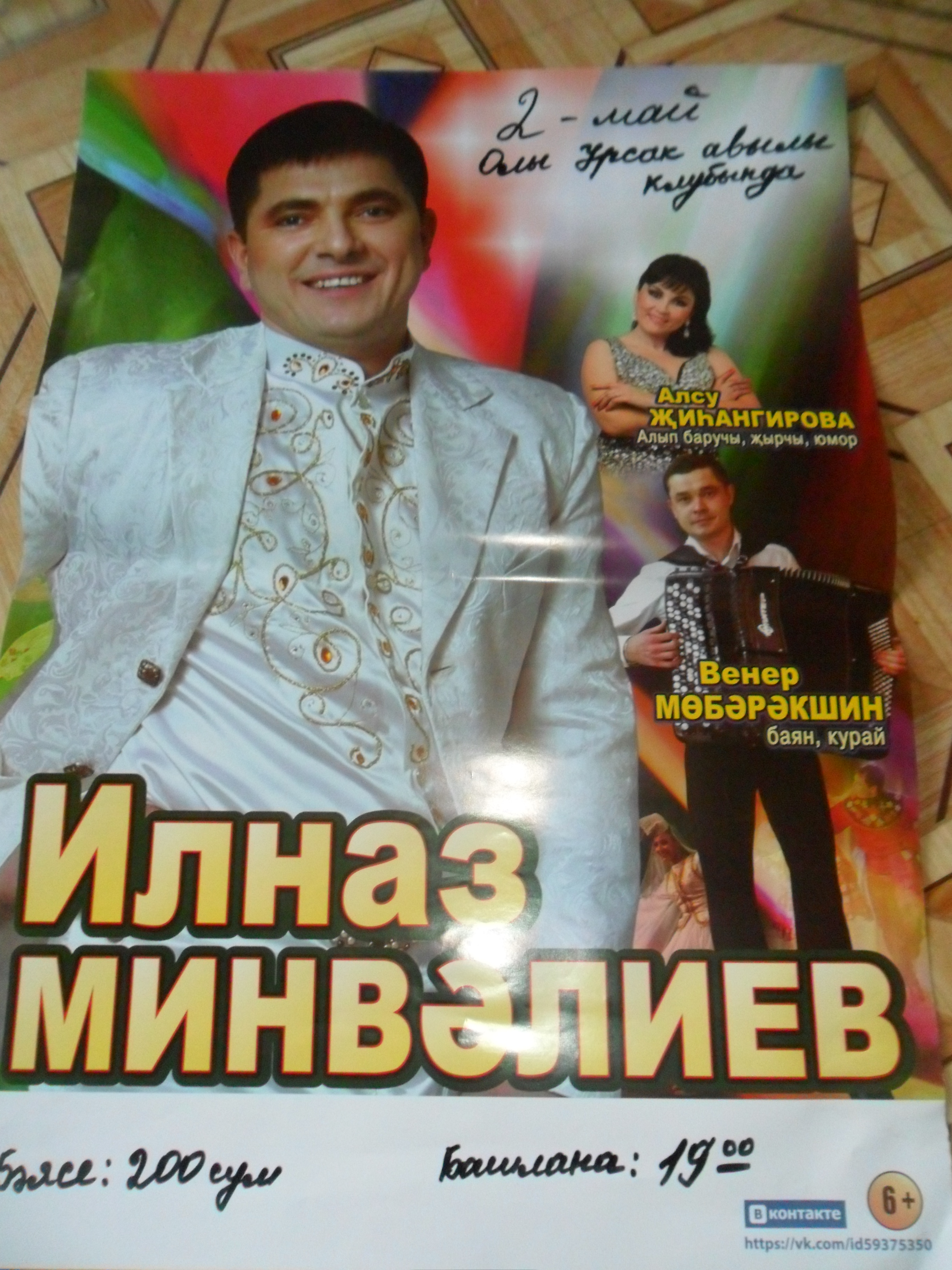 2  мая  всех  приглашаем  в  Большерусаковское  СДК  на  праздничный  концерт  Илназа  Мминвалиева,которое  состоится  в 19-00.
